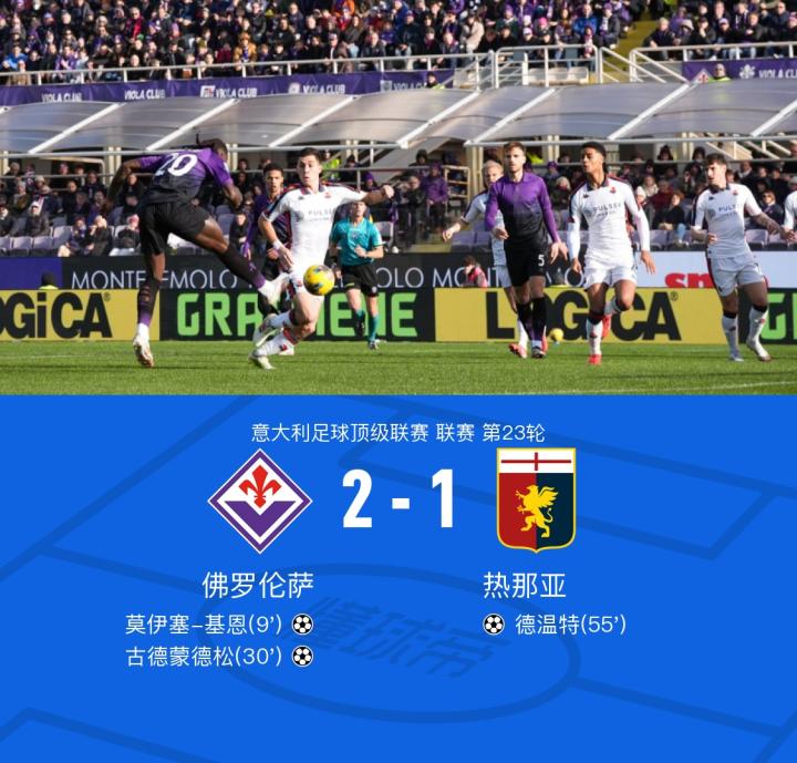 在意甲联赛第23轮的比赛中,佛罗伦萨在主场迎来了热那亚的挑战。比赛开始后不久,佛罗伦萨就取得了领先,莫伊塞-基恩在第10分钟神来之笔一脚巧射破门,为球队取得1-0的领先。