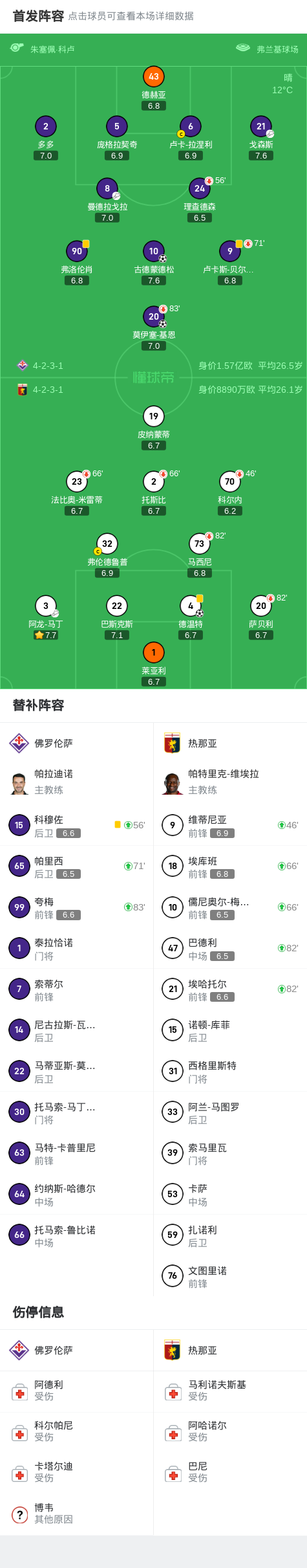 意甲联赛佛罗伦萨2-1战胜热那亚